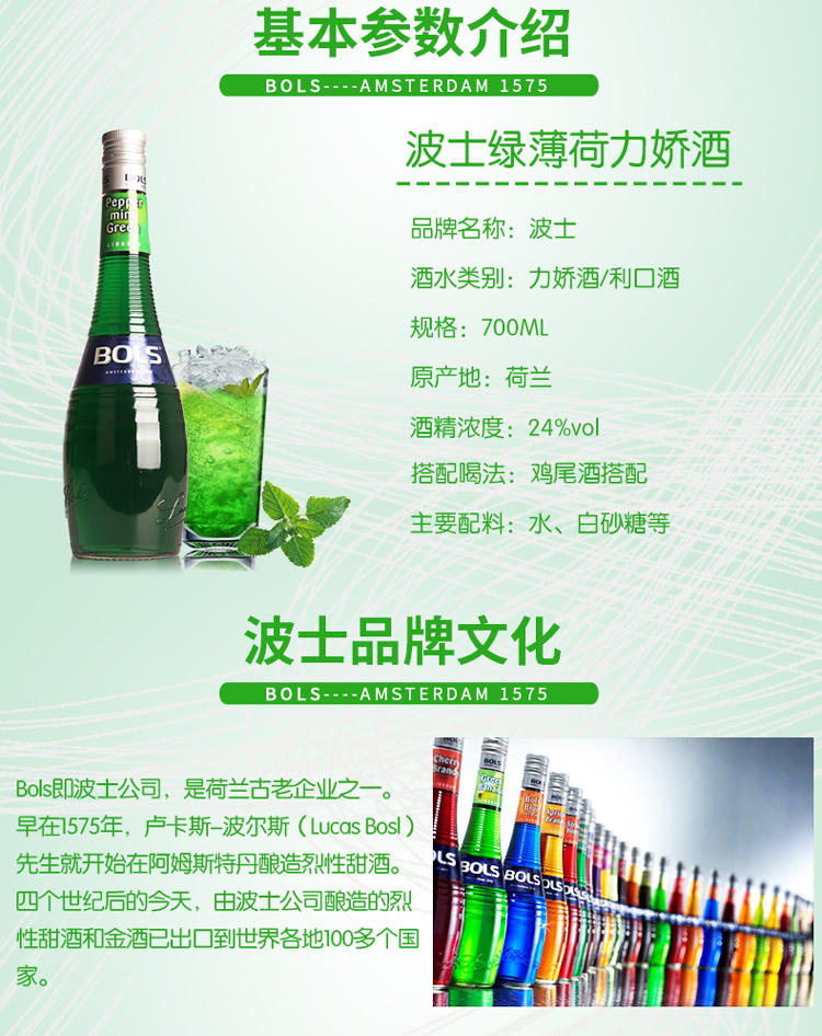 原产国:荷兰 净含量:700ml 分类:力娇酒 原料与辅料:水、白砂糖、食用酒精、绿薄荷味食用香料、柠檬酸 酒精度:24%vol 灌装日期:见瓶身标签(年/月/日) 贮藏条件:请存放于阴凉干燥处.
