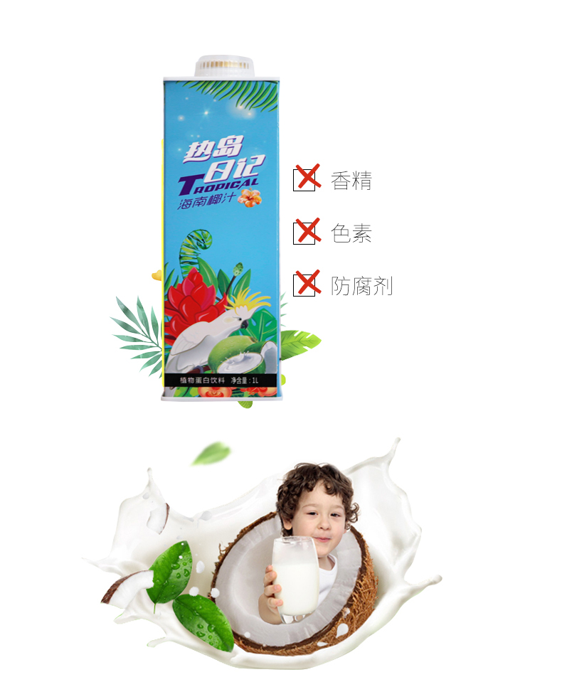 品名:热岛日记海南椰汁 净含量:1L 箱规:1L*8 配料:纯净水、鲜椰肉汁、一级白砂糖、食品添加剂(酷朊酸钠,单硬脂酸甘油脂、庶糖脂肪酸酯) 蛋白质≥0.5% 保质期:12个月 生产日期:(批号)见盒体 产品批准号:Q/RDYX 0001S 储存条件:常温保存,请放置阴凉干燥处,避免阳光直接照射.